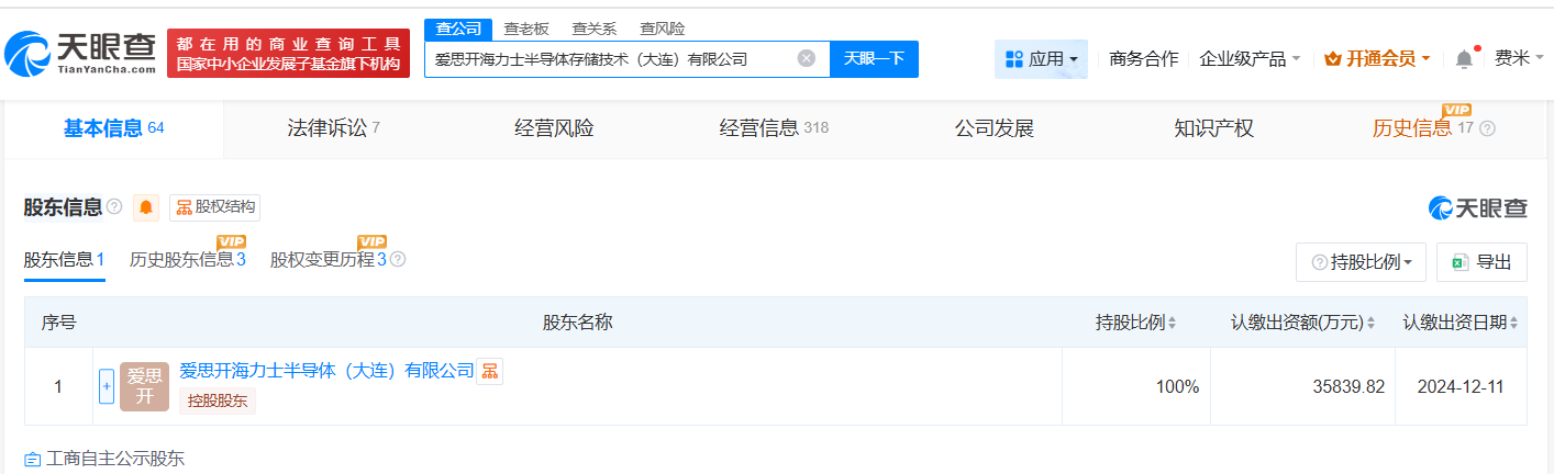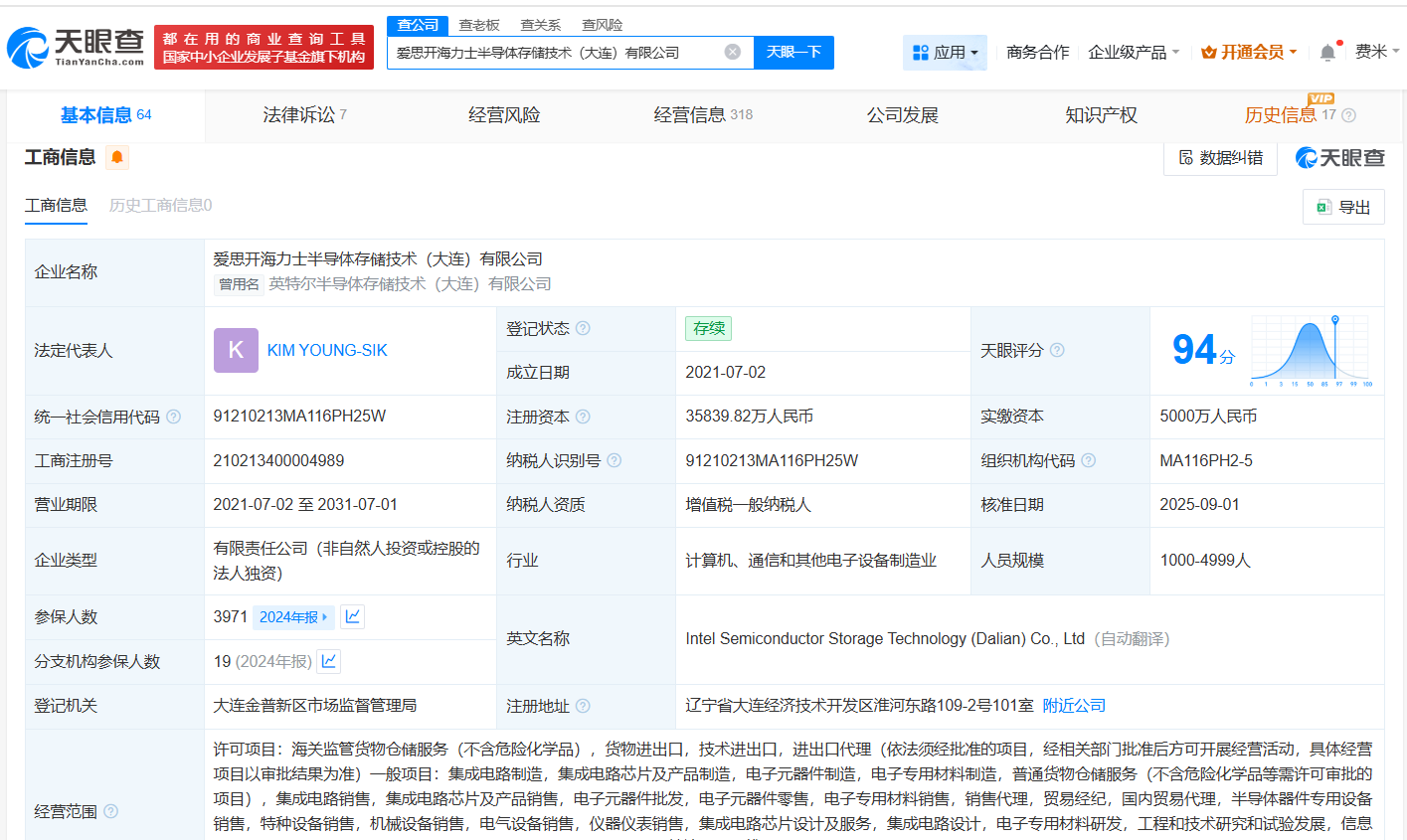 爱思开海力士半导体存储技术(大连)有限公司成立于2021年7月,法定代表人为KIM YOUNG-SIK,注册资本约3.6亿人民币,经营范围包括集成电路制造、集成电路芯片及产品制造、电子元器件制造等。股东信息显示,该公司由爱思开海力士半导体(大连)有限公司全资持股。变更记录显示,今年3月,该公司原股东Intel Asia Holding Limited(英特尔亚洲控股有限公司)退出。